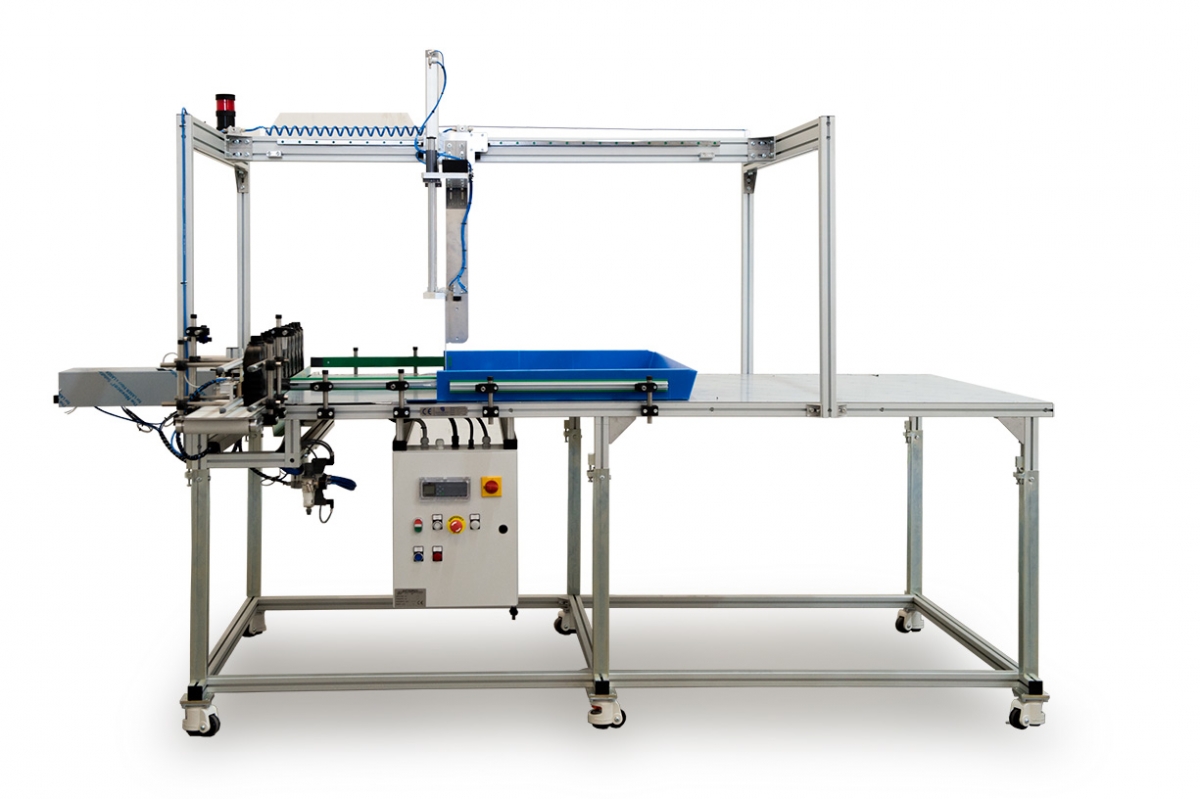 Pallettizzatore a banco per la disposizione di flaconi in vassoi con asse elettrico
