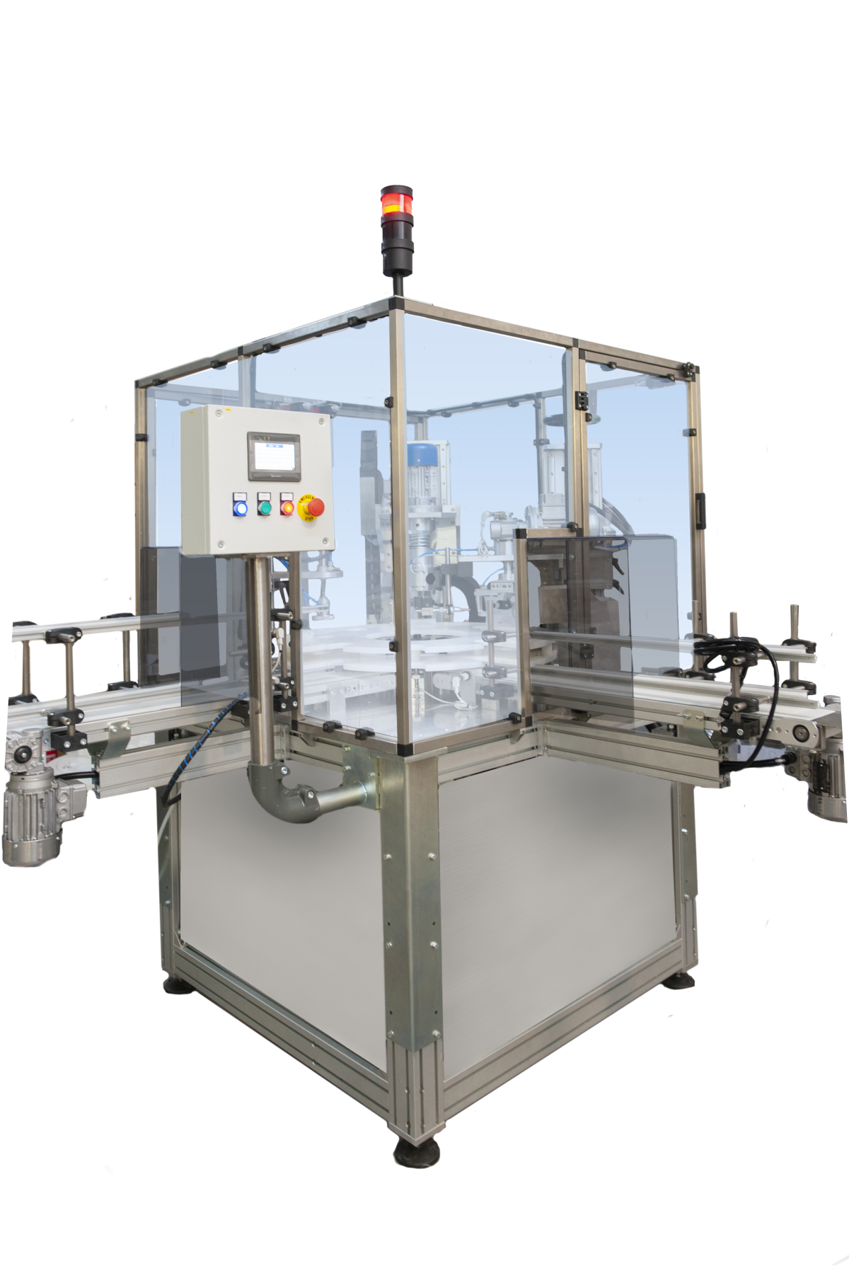 La MACCHINA ROTATIVA AD INTERMITTENZA - TAGLIO FRESATURA E PROVA TENUTA FLACONI è una macchina a funzionamento automatico che permette di effettuare operazioni di taglio, fresatura e prova di tenuta di flaconi di materiale plastico.